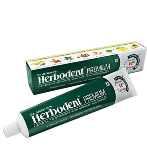Herbal Extracts of Cardamon (Elettaria Cardamomum), Aniseed (Foeniculum Vulgare Mill, Kulanjan (Alpinia Galanga), Clove (Syzygium Aromaticum), Ashok (Saraca Asoca), Bakul (Mimusops Elengi), Neem (Azadirachta Indica), Tomar (Zanthoxylum Alatum), Cinnamon (Cinnamomum Zeylanicum), Giloy (Tinospora Cordifolia), Vaividang (Embelia Ribes), Menthol (Mentha Arvensis), Spearmint (Mentha Spicata), Camphor (Camphora), Thymol (Carum Copticum), Methyl Salicylate, Coriander (Coriandirum Sativum), Ginger (Zingiber Officinale), Eucalyptus (Eucalyptus Globulus), Lemon (Citrus Limonum), Jyotismati (Celastrus Paniculatus) in toothpaste base containing Glycerine, Precipitated Silica, Sodium Lauryl Sulphate, Sucralose, Sodium Carboxymethyl Cellulose, Aqua and CI 42090, CI 19140.